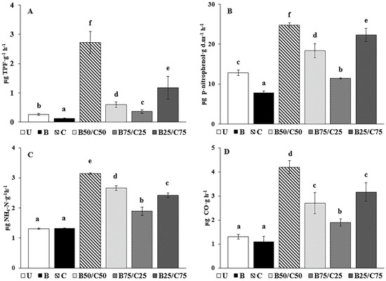 URE activity, due to extracellular enzymes capable of catalyzing the hydrolysis of urea to CO2 and NH4+ [49], was not affected by the addition of biochar compared to control soil, while the most effective treatment enhancing such activity was compost alone (+2.39-fold), followed by B50/C50 > B25/C75 > B75/C25 (Figure 2C). The addition of compost (alone or in mixture), by increasing soil nutrient availability, could have stimulated microbial activity resulting in increased URE synthesis, which is required to meet the nitrogen demand of the microbial community [8,50]. These results agree with those of Tang et al. [7], who reported a null influence of biochar on URE and a positive effect of compost and biochar–compost combination on such enzyme activity.