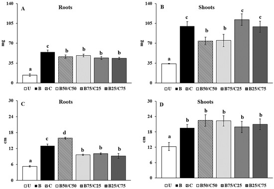 Root (A) and shoot (B) dry weight and root (C) and shoot (D) length of rigid ryegrass grown on the untreated soil (U) and on soils treated with biochar (B), compost (C), and biochar–compost mixtures (B50/C50; B75/C25; B25/C75). For each plant measure, mean values followed by different letters denote statistically significant differences (p < 0.05) according to the Fisher’s least significant difference (LSD) test (p < 0.05) (mean values ± SE; n = 3).
