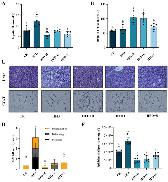 The levels of total cholesterol (TC), total bile acids (T-BAs), and indicators of liver damage were meticulously assessed. Panels (A,B) illustrate the concentrations of hepatic TC and T-BAs, respectively. Panel (C) displays representative histological images of liver and fat sections, stained with hematoxylin and eosin (H&E) at 200× magnification and the scale bar is 200 μm. The NAFLD Activity Score (NAS) of liver sections is depicted in panel (D), while panel (E) presents an analysis of adipocyte size within fat sections. The data are presented as mean ± SD. Statistically significant differences among the multiple groups (P < 0.05) are denoted by distinct letters, highlighting the differential impacts of these treatments on liver health and adiposity. CK: mice fed a standard chow diet with normal saline. HFD: mice fed a high-fat diet with normal saline. HFD+H: mice fed a high-fat diet with high-dose PPE (400 mg/kg/day). HFD+L: mice fed a high-fat diet with low-dose PPE (200 mg/kg/day). HFD+S: mice fed a high-fat diet with statin (10 mg/kg/day).