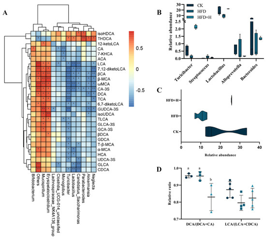 The above studies have confirmed that PPE alleviates NAFLD by regulating cholesterol metabolism and BAs metabolism, but it remains unclear whether BAs metabolism is related to PPE-driven structural changes in gut microbiota. Therefore, a correlation analysis was conducted on the structural changes in gut microbiota and changes in BAs metabolism in NAFLD mice after PPE intervention. At the genus level, Spearman correlation analysis was performed on the top 30 differential microorganisms and 15 differential BAs between the HFD and HFD+H groups, and data without significant correlation were filtered out. There were negative correlations between taurohyodeoxycholic acid (THDCA) and isohyodeoxycholic acid (isoHDCA) with Mucispirillum, Erysipelatoclostridium, and Bifidobacterium and positive correlations with Lactobacillus, Akkermansia, Parabacteroides, Neglecta, Turicibacter, Lachnospiraceae_NK4A136_group, Monoglobus, Candidatus_Saccharimonas, and Clostridia_UCG−014_unclassified (Figure 5A). Gut microbiota with BSH activity (Turicibacter, Streptococcus, Lactobacillus, Alloprevotella and Bacteroides) were enriched in the HFD+H group compared to the HFD group (Figure 5B,C), but the ratio of DCA/(DCA+CA) was significantly reduced (Figure 5D).