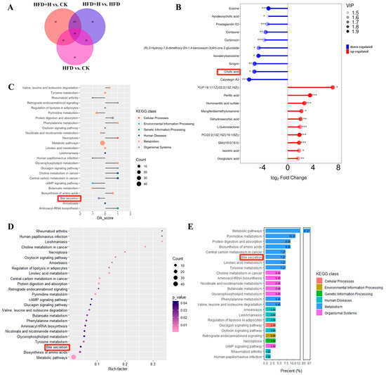 The OPLS-DA model indicated significant metabolic differences between the HFD and HFD+H groups, with a total of 179 differential metabolites identified in HFD vs. HFD+H (Figure 6A and Figure S1). Among these differential metabolites, there were 10 significantly upregulated, 10 significantly downregulated, and 159 insignificantly differential metabolites (Figure 6B). Notably, cholic acid was among the 10 significantly downregulated differential metabolites in the HFD+H group. Pathway enrichment analysis demonstrated a significant enrichment of the bile secretion pathway, with a proportion of 7.27% of detected metabolites participating in this pathway (Figure 6C–E).
