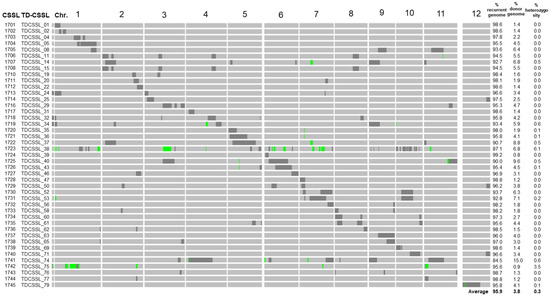 Schematic representation of the genotypes and percentage of genotypic composition of TD-CSSLs. The IDs at Nagoya (1701–1745) and original TD-CSSL IDs are shown on the left. The diagram shows the introgression of DV85 alleles (black) in the genetic background of T65 (gray). Green bars represent heterozygous regions. The right panel shows the percentage of the markers of recurrent (T65), donor (DV85), and heterozygous genotypes.
