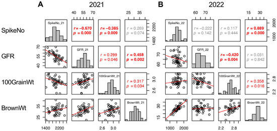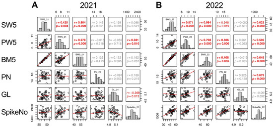 Correlation matrix of the traits correlated with SpikeNo (SW5, PW5, BM5, PN, and GL) in 2021 (A) and 2022 (B). Frequency distributions of each trait are shown on diagonal lines. Upper diagonal contain correlation coefficients (r) and p values (p), and lower diagonal contains scattergrams of the paired traits and regression lines in red.