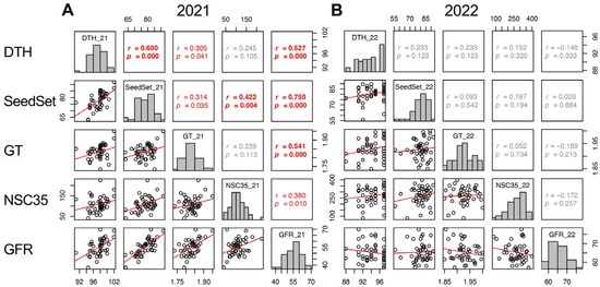 Correlation matrix of the traits correlated with GFR (DTH, SeedSet, GT, NSC35) in 2021 (A) and 2022 (B). Frequency distributions of each trait are shown on diagonal lines. Upper diagonal contain correlation coefficients (r) and p values (p), and lower diagonal contains scattergrams of the paired traits and regression lines in red.