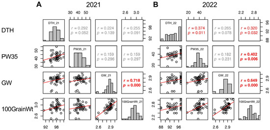 Correlation matrix of the traits correlated with 100GrainWt (DTH, PW35, and GW) in 2021 (A) and 2022 (B). Frequency distributions of each trait are shown on diagonal lines. Upper diagonal contain correlation coefficients (r) and p values (p), and lower diagonal contains scattergrams of the paired traits and regression lines in red.