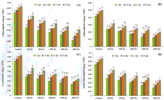 Influence of different inoculum densities of Meloidogyne enterolobii on photosynthetic pigments in tomato plants at 7, 14, 21, and 28 dpi. (A) Chlorophyll a content; (B) Chlorophyll b content; (C) Carotenoids content; (D) Total chlorophyll content. Bars represent mean ± standard error (n = 5). The different letters on the bars represent the significance difference according to Duncan’s multiple range test (p < 0.05).