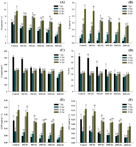 Influence of different inoculum levels of Meloidogyne enterolobii on leaf gas exchange measurements in tomato plants at 7, 14, 21, and 28 dpi. (A) The net photosynthesis rate (Pn); (B) Transpiration rate (Tr); (C) Intracellular CO2 (Ci); (D) Partial pressure of intercellular CO2 (PCi); (E) Total conductance of H2O (GTW); (F) Total conductance of CO2 (GTC). Bars represent mean ± standard error (n = 5). The different letters on the bars represent the significance difference according to Duncan’s multiple range test (p < 0.05).