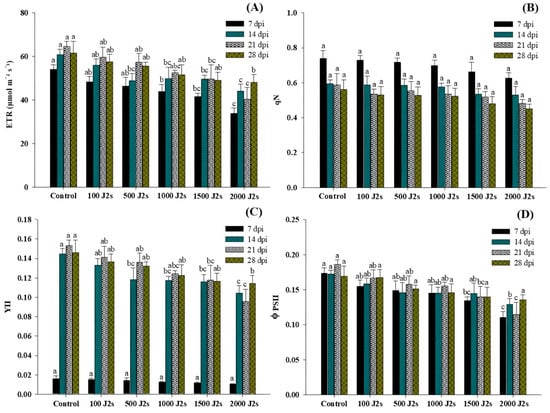 Influence of different inoculum levels of Meloidogyne enterolobii on chlorophyll fluorescence measurements in tomato plants at 7, 14, 21, and 28 dpi. (A) The electron transport rate of PSII (ETR); (B) non-photochemical quenching coefficient (qN); (C) PSII quantum yield of light (YII); (D) PSII efficiency (φPSII). Bars are mean ± standard error (n = 5). Bars represent mean ± standard error (n = 5). The different letters on the bars represent the significance difference according to Duncan’s multiple range test (p < 0.05).
