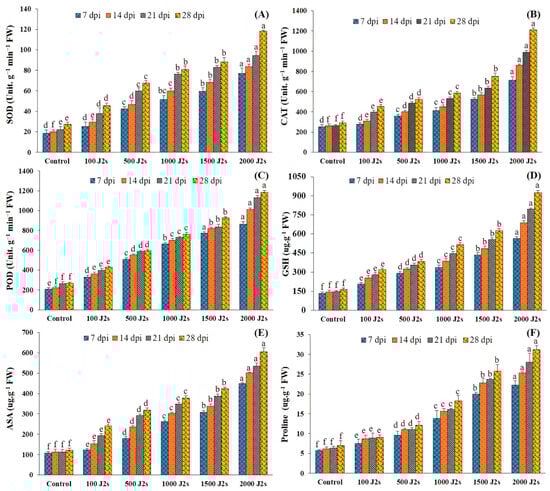 Influence of different inoculum levels of Meloidogyne enterolobii on antioxidants and proline content at 7, 14, 21, and 28 dpi. (A) Superoxide Dismutase (SOD); (B) Catalase (CAT); (C) Peroxidase (POD); (D) Glutathione (GSH); (E) Ascorbate (ASA); (F) Proline. Bars represent mean ± standard error (n = 5). The different letters on the bars represent the significance difference according to Duncan’s multiple range test (p < 0.05).