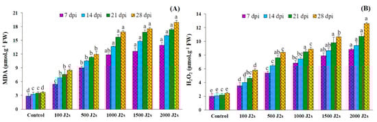 Influence of different inoculum levels of Meloidogyne enterolobii on oxidative stress responses at 7, 14, 21, 28 dpi. (A) Lipid peroxidation (malondialdehyde (MDA)); (B) Hydrogen peroxide (H2O2). Bars represent mean ± standard error (n = 5). The different letters on the bars represent the significance difference according to Duncan’s multiple range test (p < 0.05).