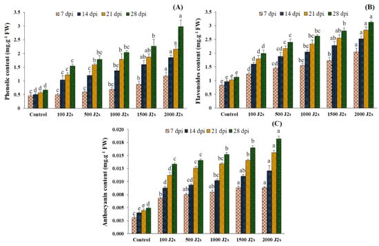 Influence of different inoculum levels of Meloidogyne enterolobii on secondary metabolites at 7, 14, 21, 28 dpi. (A) Total phenolic content; (B) Total flavonoid content; (C) Total anthocyanin content. Bars represent mean ± standard error (n = 5). The different letters on the bars represent the significance difference according to Duncan’s multiple range test (p < 0.05).