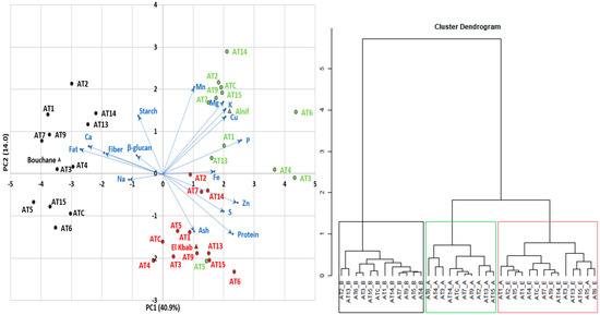 Based on the relationship between the PCA components and the traits, and the support of the dendrogram, three groups were highlighted for their similarities. Growing conditions first determine the distribution of the lines, as shown in Figure 1. When lines are grown at the Bouchane site (black color), the kernels tend to contain more fat, fiber, and calcium and relatively less phosphorus and zinc. This was more pronounced in AT1, AT2, AT7, and AT9. The lines from the Alnif area (green color) were divided into a group with high levels of phosphorus, zinc, sulfur, and iron (AT3, AT4, AT6) and another cluster with relatively high levels of starch, manganese, magnesium, potassium, and copper (AT2, AT7, AT9, AT14, AT15, and ATC). The El Kbab locality (red color) is characterized by high protein and ash content and relatively low starch content, probably due to an offsetting compensation between protein and starch, as commonly reported in cereals. This group is mainly represented by lines AT3, AT6, AT13, AT15. Alnif’s AT5 (in green) behaved in the same way as the latter group.