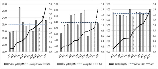 The protein content and location interaction of 24% is higher than that of fat (14%) and fiber (17%) (Table 7). The AMMI test shows, in Figure 2, the mean values of protein, fat, and fiber of the lines and their stability (ASV). The lower the ASV, the more stable a line’s protein, fat, or fiber content is across the trial locations. Based on protein ASV, advanced lines are grouped into three clusters; cluster 1 (AT1, AT2, AT7, AT6) includes the most stable lines for protein content, with AT6 having the highest protein average of 25.5%. Cluster 2 includes lines AT13, AT9, AT4, AT14, which are characterized by intermediate protein ASV values ranging from 1.2 to 2.4. AT13 and AT4 provide protein contents above the total protein average of the experiment (23.1%). Lines AT15, ATC, AT5, and AT3 form the cluster 3. They have a relatively higher interaction with the environment for the protein content (ASV between 2.7 and 4.6); among them, AT15, AT5, AT3 exceed the mean protein value. In terms of fat content, four lines (AT9, AT7, AT13, AT14) exceeded the overall average fat value of 8.38%. Their fat stability ranged from 0.3 to 0.7. For the fiber content, six of the lines exceeded the mean fiber content of 7.23%; AT2, AT6, and AT13 provided the highest fiber values with good, medium, and low stability (0.1, 0.5, and 1.6, respectively). Considering the three quality components of protein, fat, and fiber (3 degrees) or two of them (2 degrees), only AT13 exceeded the averages of the three quality components. Lines AT3, AT5, AT6, and AT15 have better quality potential for protein–fiber combination.