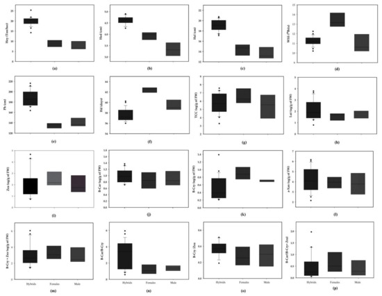 Box plots of the F1 hybrids and their corresponding parents on yield-related traits and carotenoids across two seasons between 2021 and 2022. (a) Husked ear yield; (b) husked ear diameter; (c) husked ear length; (d) water-soluble solid; (e) plant height; (f) harvest date; (g) total carotenoid content; (h) lutein; (i) zeaxanthin; (j) β-carotene (k) β-cryptoxanthin; (l) α-xanthophyll; (m) β-cryptoxanthin + zeaxanthin; (n) β-carotene/β-cryptoxanthin; (o) β-cryptoxanthin/zeaxanthin; (p) β-carotene/(β-cryptoxanthin + zeaxanthin). The plus sign “