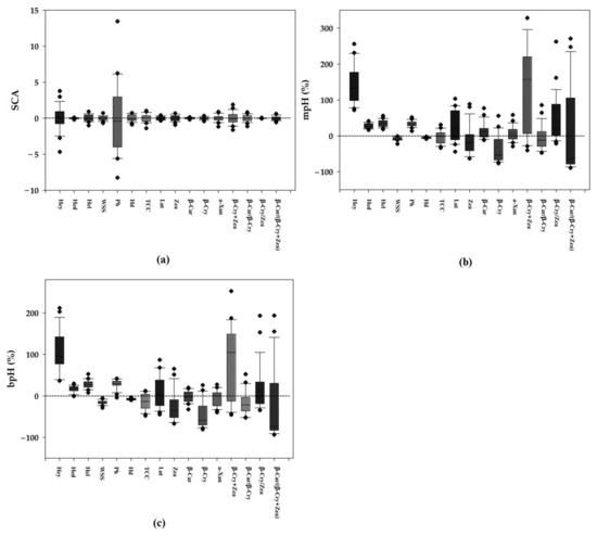 The second fraction was used to quantify each carotenoid. The extracts were concentrated until dryness under nitrogen flux. Afterward, samples were stored at −20 °C until further analysis. The frozen carotenoid extract was redissolved in 1 mL of methyl tert-butyl ether (MTBE): methanol (75: 25, v/v) and filtered through a 0.45 µm nylon membrane filter. The composition of solvents and the gradient elution conditions used were described by Wasuwatnakul et al. [25] and Gupta et al. [64] with modifications. Reversed-phase HPLC analysis of carotenoids was performed using a Shimadzu system (Shimadzu Co., Ltd., Tokyo, Japan) equipped with a binary pump (mod. LC-20AC pump) and a diode array detector (mod. SPD-M20A). The HPLC separation was performed on a reversed-phase C30 column (250 × 4.6 mm, Ø 3 µm) coupled to a 20 × 4.6 mm C30 guard column (YMC Co., Ltd., Kyoto, Japan). Operating conditions were as follows: flow rate of 1.5 mL/min, column temperature of 25 °C, injection volume of 20 µL, and a detection wavelength of 350–600 nm. The mobile phases used were methanol (phase A) and MTBE (phase B). Gradient elution was 50% B at 0 min, followed by a linear gradient to 60% B to 7.00 min at a flow rate of 1.5 mL/min. The 12.10 min gradient was changed to 15% B and was returned to the initial condition by 16.00 min. The four carotenoids, including lutein, zeaxanthin, β-carotene, and β-cryptoxanthin, were identified based on the same retention time and absorption spectral characteristics of external standards. The results for the carotenoids were expressed as µg/g of FW. A series of five sums and ratios, including α-xanthophyll (sum of lutein and zeaxanthin), β-cryptoxanthin + zeaxanthin, β-carotene/β-cryptoxanthin, β-cryptoxanthin/zeaxanthin, and β-carotene/(β-cryptoxanthin + zeaxanthin), followed Baseggio et al. [33].