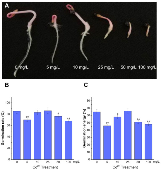 2.1. Response of P. acinosa Seeds to Cd2+ Treatment
