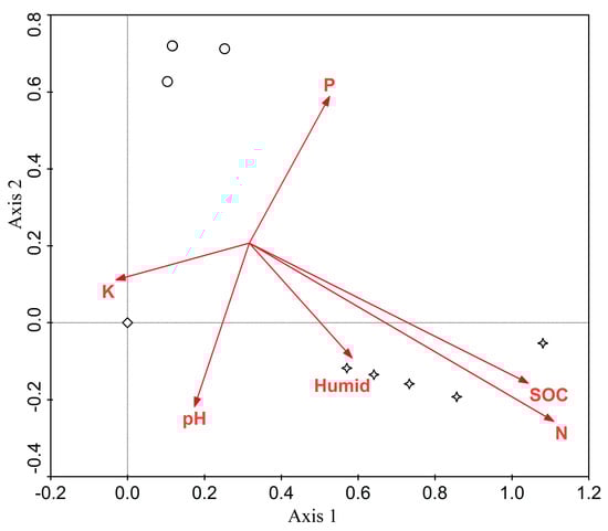 PCA biplot of algal communities in the soils of the Russian Far East, with axes 1 and 2 represented. Quantitative environmental variables are indicated by arrows. A (circles): association Coelastrelletum aeroterrestricae; B (stars): association Vischerietum magnae; C (diamond): association Bracteacoccetum bullati. SOC—soil organic carbon; N—total nitrogen; Humid—humidity; pH—actual acidity; K—available potassium; P—available phosphorus. All 19 samples were included in the PCA biplot, but only 9 of them are visible because they are overlaying each other.