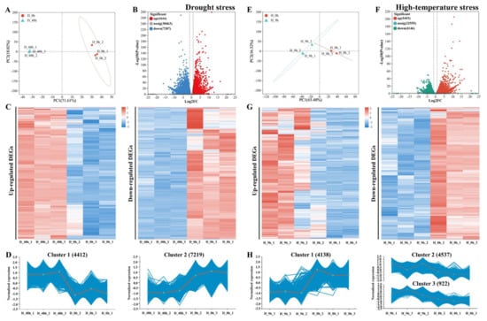 Identification of differently expressed genes (DEGs) from drought or high-temperature treatments. (A,E) Principal component analysis (PCA) of RNAs detected in Pyrus betulifolia seedlings before (D_0 h, H_0 h) and after being subjected to drought stress (for 48 h, D_48 h) or high-temperature stresses (for 9 h, H_9 h). PC1 means the first principal component and PC2 means the second principal component. (B,F) Volcano plots show the upregulated genes and downregulated genes of the comparison groups D_48 h_vs._D_0 h and H_9 h_vs._H_0 h, respectively. Red solid circles represent the samples (1, 2, 3) before drought (D_0 h) or high-temperature stress treatment (H_0 h), and cyan solid rectangles represents the samples (1, 2, 3) after drought stress for 48 h (D_48 h) and high-temperature stress for 9 h (H_9 h), respectively. Red dot indicates upregulated genes, blue or green represents downregulated genes, and gray means genes with no significant change. (C,G) Heat maps show the downregulated and upregulated genes in the comparison groups of D_48 h_vs._D_0 h and H_9 h_vs._H_0 h, respectively. (D,H) Hierarchical cluster analysis of DEGs in the comparison groups D_48 h_vs._D_0 h and H_9 h_vs._H_0 h, respectively. The blue lines in each group represent the gene expression pattern and the gray lines indicate the expression trend of all the genes in it.