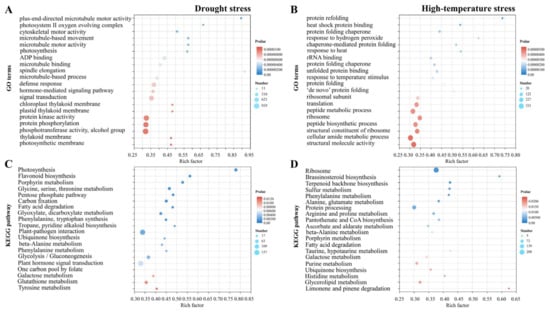 The functional enrichment analysis of the DEGs obtained from drought or high-temperature treatments. (A,C) The enriched Gene Ontology (GO) terms for DEGs identified from Pyrus betulifolia seedlings before (D_0 h, H_0 h) and after being subjected to drought stress (for 48 h, D_48 h) or high-temperature stresses (for 9 h, H_9 h), respectively. (B,D) The Kyoto Encyclopedia of Genes and Genomes (KEGG) enrichment analysis of DEGs isolated from Pyrus betulifolia seedlings before (D_0 h, H_0 h) and after being subjected to drought stress (for 48 h, D_48 h) or high-temperature stresses (for 9 h, H_9 h), respectively. The number of genes in each pathway is equal to the size of the dot. The dot color represents the p-value.