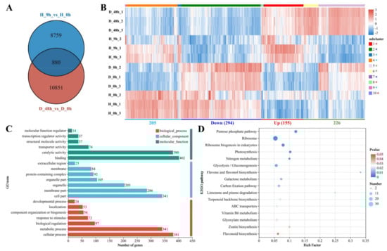 The overlap analysis of the differently expressed genes (DEGs) responding to drought and high-temperature stresses. (A) Venn diagram analysis shows that 880 DEGs respond to both drought and high-temperature stresses. (B) The heat map shows the DEGs that are downregulated and/or upregulated by drought or high temperature among these 880 DEGs. The clusters in the same group with a similar or an opposite expression trend in D_48h vs. D_0h, and H_9h vs. H_0h comparisons were decorated with the same colour asterisk. The enriched gene ontology (GO) terms (C) and The Kyoto Encyclopedia of Genes and Genomes (KEGG) enrichments (D) for these 880 DEGs. The number of genes in each pathway is equal to the size of the dot. The dot color represents the p-value.