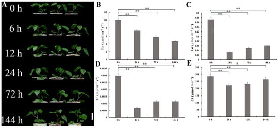 The net photosynthetic rate (Pn, μmol m−2 s−1), stomatal conductance (Gs, μmol m−2 s−1), transpiration rate (Tr, mol m−2 s−1), and intercellular CO2 concentration (Ci, µmol mol−1) were significantly decreased (p < 0.05, p < 0.01) in salt-treated G. anomalum plants compared to the 0 h control (Figure 1B–E). Notably, Gs, Tr, and Ci all showed slight increases at 72 and 144 h compared to 24 h, while Pn exhibited a decreasing trend throughout the whole salt stress period (Figure S1A–D).
