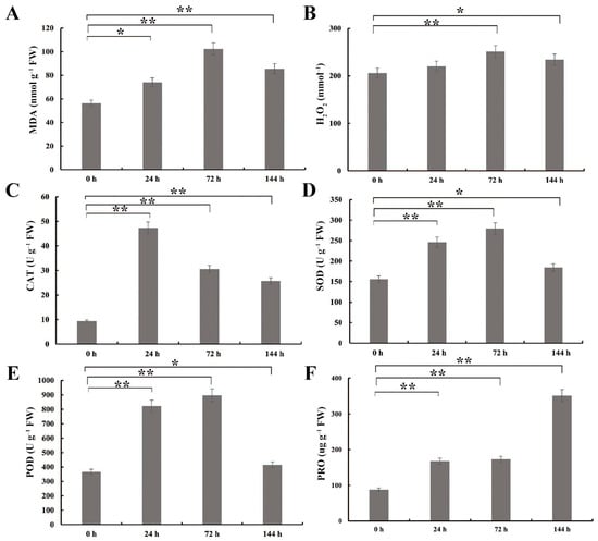 To detect the degree of oxidative and membrane damage caused by salt stress, H2O2 and MDA contents were quantified in salt-treated G. anomalum plants. In the leaves, the relative MDA content showed a significant increasing trend (p < 0.05, p < 0.01), reaching a peak at 72 h (Figure 2A). Meanwhile, the H2O2 content did not change after 24 h of salt treatment, but significantly increased at 72 h and 144 h (p < 0.05, p < 0.01) (Figure 2B). Most notably, both MDA and H2O2 contents showed a slight decline at 144 h (Figure 2A,B). This corresponded with significant salt-stress-related increases (p < 0.05, p < 0.01) in antioxidant enzyme activities, including CAT, SOD, and POD (Figure 2C–E). POD and SOD activity reaching their highest values at 72 h of salt stress, whereas CAT peaked at 24 h (Figure 2C–E). Finally, as the osmoregulatory substance (proline (PRO) content) showed a significant increase at 24 h of salt stress, and a continued increasing trend with further treatment, reaching its highest value at 144 h (Figure 2F).
