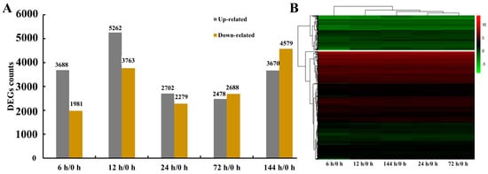 Differentially expressed genes (DEGs) in G. anomalum roots relative to the 0 h control were identified at 6, 12, 24, 72, and 144 h of treatment with 350 mmol/L NaCl. The screening criteria were based on transcript expression abundance (|log2FoldChange| ≥ 1 and Padj ≤ 0.05), and yielded a total of 15,476 DEG (Table S2). Concerning each timepoint, 5699 (3688 up-regulated/1981 down-regulated), 9025 (5262 up-regulated/3763 down-regulated), 4981 (2702 up-regulated/2279 down-regulated), 5166 (2478 up-regulated/2688 down-regulated), and 8249 (3670 up-regulated/4579 down-regulated) DEGs were detected at 6, 12, 24, 72, and 144 h of salt treatment, respectively (Figure 3A and Table S2). The greatest number of up-regulated genes was observed with 6 h of salt stress, while the greatest number of down-regulated genes was seen at 144 h (Figure 3A). Clustering of the expression patterns of these 15,476 DEGs revealed the 6, 12, 24, and 72 h samples to be closely grouped, representing the early stage of salt stress, while the 144 h sample was separately grouped, representing the late stage (Figure 3B)