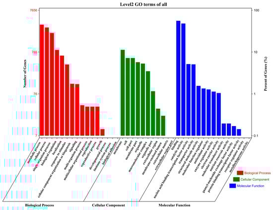 Gene Ontology (GO) annotation distribution of genes differentially expressed in G. anomalum under salt stress. Histograms represent the functional distribution; the left y-axis shows the number of annotated genes, and the right y-axis represents the percentage of total genes.