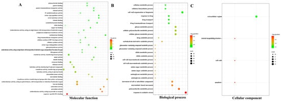 Gene Ontology (GO) enrichment analysis of genes differentially expressed in G. anomalum under salt stress. (A) Molecular function. (B) Biological process. (C) Cellular component. Color intensity indicates relative degree of significance; dot size indicates the number of DEGs annotated with the term. Only the top 30 significantly enriched terms are displayed for each category.