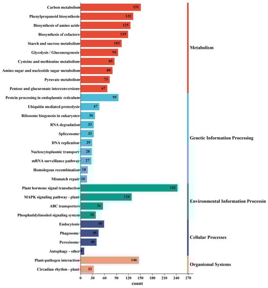 Of the 15,476 DEGs, 2698 were annotated to 125 metabolic pathways in the Kyoto Encyclopedia of Genes and Genomes (KEGG) database, including 3193 DEGs in metabolism, 458 in genetic information processing, 465 in environmental information processing, 153 in cellular processes, and 179 in organismal systems pathways. Because a gene may be involved in multiple pathways, the sum of DEG counts over all the pathways is greater than the number of genes annotated (Figure 6 and Table S5). Because a gene may be involved in multiple pathways, the sum of DEG counts over all the pathways is greater than the number of genes annotated (Figure 6 and Table S5). Of the DEGs implicated in metabolism, most had functions relating to carbon metabolism (ko01200), phenylpropanoid biosynthesis (ko00940), biosynthesis of amino acids (ko01230), biosynthesis of cofactors (ko01240), starch and sucrose metabolism (ko00500), glycolysis/gluconeogenesis (ko00010), cysteine and methionine metabolism (ko00270), amino sugar and nucleotide sugar metabolism (ko00520), and pyruvate metabolism (ko00620) (Figure 6 and Table S5). For those involved in genetic information processing, a large portion were annotated as contributors to protein processing in the endoplasmic reticulum (ko04141), ubiquitin mediated proteolysis (ko04120), ribosome biogenesis in eukaryotes (ko03008), RNA degradation (ko03018), spliceosome (ko03040), DNA replication (ko03030), mRNA surveillance pathway (ko03015), and nucleocytoplasmic transport (ko03013) (Figure 6 and Table S5). There were only three impacted pathways in environmental information processing, including plant hormone signal transduction (ko04075), MAPK signaling pathway–plant (ko04016), and ABC transporters (ko02010) (Figure 6 and Table S5). Among the cellular processes, the four impacted pathways were endocytosis (ko04144), peroxisome (ko04146), phagosome (ko04145), and autophagy–other (ko04136) (Figure 6 and Table S5). Finally, only two organismal systems pathways harbored DEGs: plant–pathogen interaction (ko04626) and circadian rhythm (ko04712) (Figure 6 and Table S5).