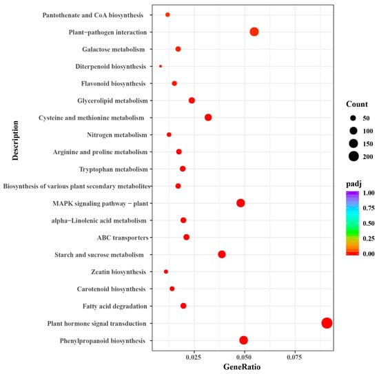 Enrichment analysis of the DEGs identified 24 important KEGG pathways. We constructed scatter plots to visualize these enrichments (Figure 7). The top enriched pathways were plant hormone signal transduction (ko04075), phenylpropanoid biosynthesis (ko00940), fatty acid degradation (ko00071), carotenoid biosynthesis (ko00906), zeatin biosynthesis (ko00908), starch and sucrose metabolism (ko00500), and MAPK signaling pathway (ko04016) (Figure 7 and Table S6).