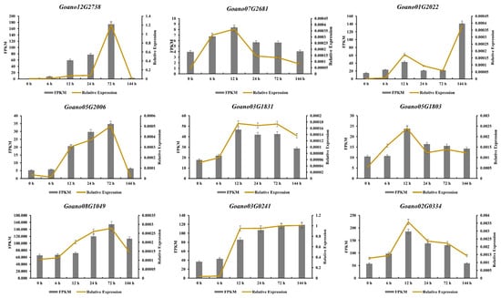 Based on the expression level in the transcriptome data and functional annotations from their orthologues in Arabidopsis, nine candidate genes potentially implicated in salt tolerance were selected to be used in quantitative real-time PCR (qRT-PCR). Relative transcript levels of these genes were computed using the 2−∆Ct method, where ∆Ct is the difference of the Ct values between the target gene products and an internal standard gene product. These nine selected genes comprised cytochrome P450 (Goano03G0241 and Goano12G2738), a WRKY transcription factor (Goano03G1831), serine acetyltransferase (Goano01G2022), a transferase family protein (Goano05G2006), a protein with a peroxidase structure domain (Goano08G1049), cellulose synthase (Goano07G2681), a 1,3-beta-glucan synthase component (Goano05G1803), and a homeobox-leucine zipper protein (Goano02G0334). The expression patterns of these nine genes as determined by qRT-PCR were consistent with the RNA-Seq data (Figure 9 and Table S8).
