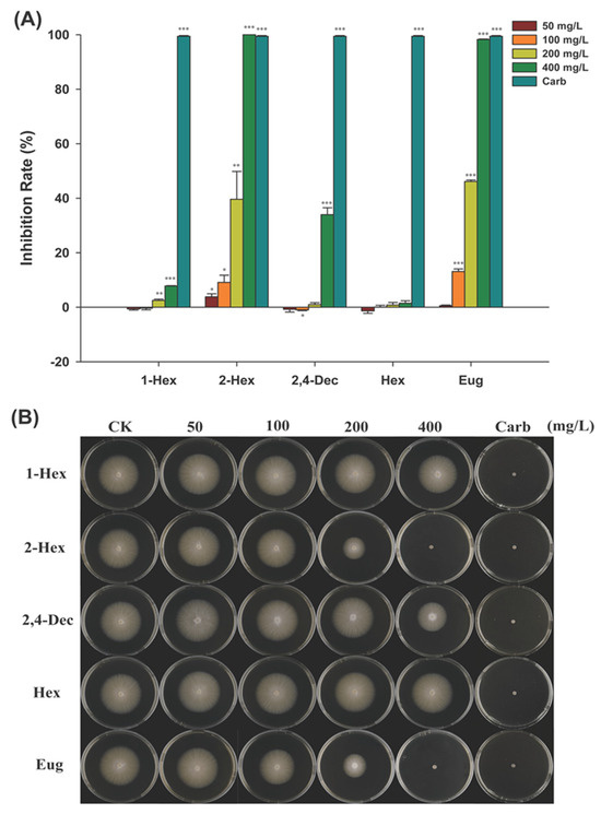 Antifungal activity on F. solani of compounds. (A) Inhibition rate of monomer compounds on F. solani; (B) Typical photos of the inhibition of F. solani growth by monomer compounds. The data collection was carried out on the 5th day. 1-Hex: 1-hexanol; 2-Hex: (E)-2-hexenal; 2,4-Dec: (E,E)-2,4-decadienal; Hex: hexanal; Eug: eugenol; Carb, carbendazol; Student’s t-test, * p < 0.05, ** p < 0.01, *** p < 0.001.
