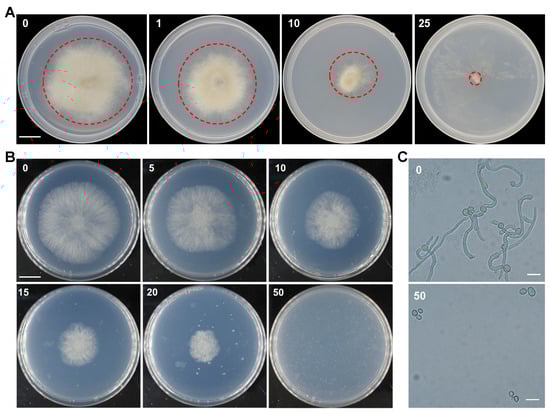 Subsequently, we used the conidial inoculation method and tested the inhibitory effects of different concentrations of geneticin on conidial germination. Similar results to the mycelial plug inoculation experiment were obtained. We found that 10–20 mg/L G418 significantly inhibited the colony growth of B05.10, and no growth was observed when the G418 concentration was increased to 50 mg/L (Figure 1B and Figure S1). Microscopic observation revealed that 50 mg/L G418 completely inhibited the germination of B. cinerea conidia (Figure 1C). Based on the above analysis, we determined that 50 mg/L or higher G418 is the appropriate selection concentration for the genetic transformation of B. cinerea, and this concentration was used subsequently.