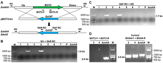 The codon-optimized gene BcNPTII was effectively used for BOT2 knockout from the mutant ΔoahA to generate double knockout strains. ΔoahA was generated from CLS1, a Chinese field strain. (A) The strategy for the generation of the BOT2 knockout mutant via the gene replacement approach; (B–D) Identification of the BOT2 knockout mutant via PCR amplification with the indicated primers by detecting BOT2 upstream recombination (B), detecting downstream recombination (C), and detecting BOT2 loss, with BOA6 presence as a control (D). Numbers 1–7 indicate randomly selected transformants, P indicates plasmid pXEGbc, and ΔoahA indicates the deletion mutant of OAHA of the CLS1 strain.