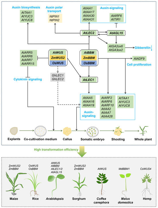 The synthesis and signaling of plant hormones, particularly auxins and cytokinins, are crucial for maintaining cell fate and organ formation [50]. The functional mechanisms of WUS and BBM are intricately linked to these hormone signaling networks. Both WUS and BBM transcriptionally regulate LEAFY COTYLEDON1 (LEC1), LEC2, and AGAMOUS-LIKE15 (AGL15) to enhance embryonic competence during somatic embryogenesis [49] (Figure 1). LEC further modulates downstream hormone signaling pathways. WUS and Arabidopsis Response Regulators (ARRs) positively and negatively regulate cytokinin signaling, respectively [51,52] (Figure 1). The synthesis of auxins, regulated by Tryptophan Aminotransferase of Arabidopsis 1 (AtTAA1), YUCCA3 (AtYUC3), and AtYUC8, along with auxin polar transport mediated by pin-formed 1 (NtPIN1) and NtPIN2, and signal transduction mainly by indole-3-acetic acid (AtIAA) and Auxin Response Factor (AtARF) family members, collectively influence the differentiation process of transformed cells [49,53] (Figure 1). Concurrently, the gibberellin metabolic pathway, regulated by GA20-oxidase genes (AtGA20ox6 and AtGA3ox2), and cell proliferation-related factors, such as the Actin depolymerizing factor (AtADF9) [54,55], play key roles in enhancing genetic transformation efficiency. LEC1/2 (e.g., AtLEC1/2) and MADS-box transcription factor AGAMOUS-LIKE 15 (e.g., AtAGL15) participate in regulating embryonic development and cell proliferation [49], thus constructing a complex regulatory network. The integrated action of WUS and BBM promotes cell proliferation and shoot formation more efficiently than either gene alone and increases the likelihood of successful transformation events, which can result in the growth of viable transgenic plants. Their synergistic effects greatly increase the genetic transformation efficiency of various plant species, such as maize, rice, and Arabidopsis, as well as sorghum (Sorghum bicolor), coffee plants, and hemp (Cannabis sativa) (Figure 1).