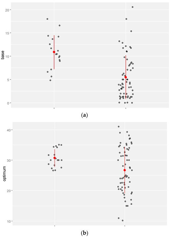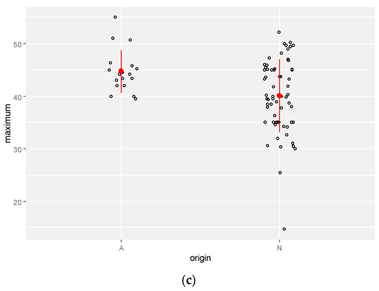 The lm procedure (a two-way ANOVA linear model) showed that some factors are more important than others with regard to the variation in cardinal temperatures. Being of native or alien origin had a significant impact on the variation in base, optimum, and maximum temperatures. All the factors, apart from the life cycle, significantly affected the base and optimum temperatures. Our results revealed that the base temperature is less influenced by ecotypes than by the optimum and maximum temperatures. The maximum temperature was not affected by year despite the base and optimum temperatures (Table 1). Alien species had higher base temperatures (mean = 10.6 °C) than the native ones (mean = 5.51 °C), and the average optimum and maximum temperatures were around 31 and 45 °C, respectively. Alien plants were also subject to narrow optimum and maximum temperatures in comparison with the native species (Figure 2).