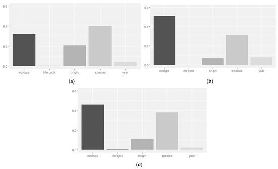 The effect size in ANOVA measured the degree of association between the effect and the dependent variable. The interaction between the species and base, optimum, and maximum temperatures accounted for 40, 31, and 38% of the total variability, respectively. The effect of ecotypes on the variation in the base, optimum, and maximum temperatures explained 32, 51, and 46% of the total variability, respectively. Being native or alien had the most effect on the base temperature (21%), whereas its effect on the optimum and maximum temperatures was around 7 to 9%, respectively. The effect of the year of study on the optimum temperature was higher than that on the base and maximum temperatures (Figure 3). In this study, the base and maximum temperatures were more affected by the species type and not by the ecotypes. The latter had a greater effect on the variation in the optimum temperature. In general, the year and life cycle had a lesser influence on the variation in cardinal temperature (Figure 3).