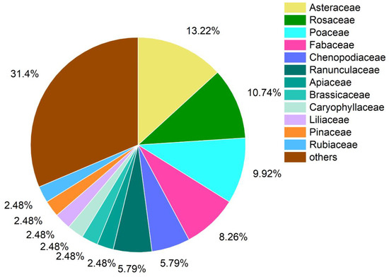 A total of 121 plant species of angiosperms from 41 families were recorded (Table S1). The most prevalent family was Asteraceae (16 species), followed by Rosaceae (13 species), Poaceae (12 species), Fabaceae (10 species), Chenopodiaceae (7 species), and Ranunculaceae (7 species). The abovementioned families comprised 53.72% of plant species (Figure 1).