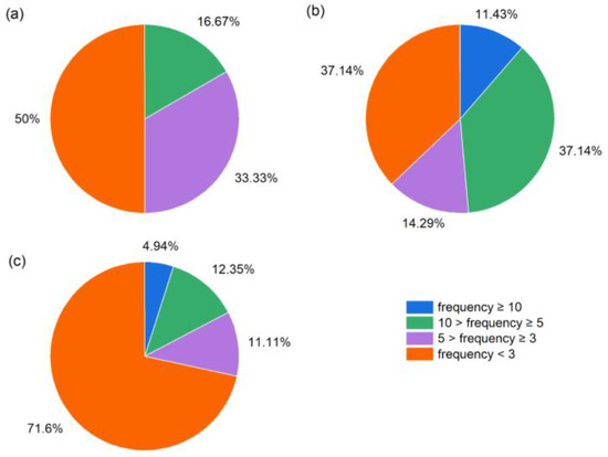 Frequency of occurrence of each species. (a): tree layer; (b): shrub layer; (c): herb layer.