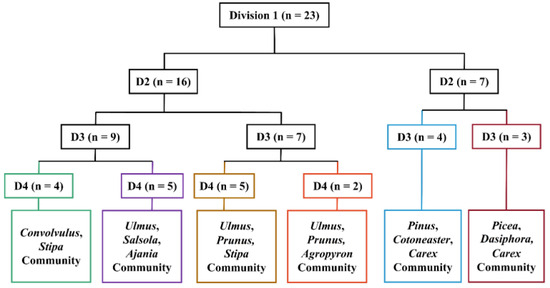 Utilizing this importance value as the foundation, a matrix of importance values for species and samples was generated for TWINSPAN delineation [76]. To enhance the stability of subsequent analyses and reduce the impact of rare species on the classification process, we synthesized existing studies and excluded species that appeared in one plot or fewer and had a total importance value of less than 1 [77]. Finally, we opted to focus solely on the importance values of 47 species; this refined approach aims to enhance the precision of our results by prioritizing the contribution of more prevalent species to the classification process.