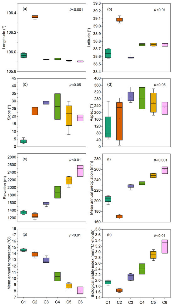 Boxplots showing the distribution ranges of environmental variables for the six plant communities classified in the study area (p-values indicate significant differences in means on each boxplot). C1: Convolvulus and Stipa community; C2: Ulmus, Salsola, and Ajania community; C3: Ulmus, Prunus, and Stipa community; C4: Ulmus, Prunus, and Agropyron community; C5: Pinus, Cotoneaster, and Carex community; and C6: Picea, Dasiphora, and Carex community. (a) Longitude, (b) Latitude, (c) Slope, (d) Aspect, (e) Elevation, (f) Mean annual precipitation, (g) Mean annual temperature, and (h) Biological aridity index).