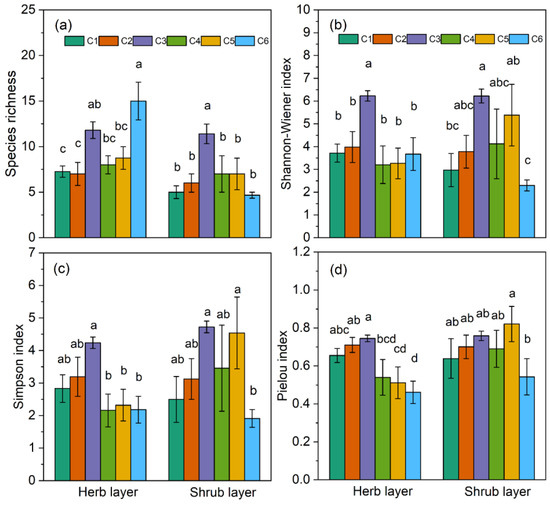 Bar charts show the differences in α-diversity of herb and shrub layers among the six plant communities classified in the study area. Different lowercase letters indicate significant differences between communities (p < 0.05). (a) Species richness, (b) Shannon-Wiener index, (c) Simpson index, and (d) Pielou index.