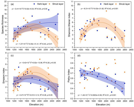 Elevational patterns of species diversity index in shrub layer and herb layer. Trend lines and shaded areas represent the fitted values from linear regression with quadratic and their 95% confidence intervals, respectively. (a) Species richness, (b) Shannon-Wiener index, (c) Simpson index, and (d) Pielou index.