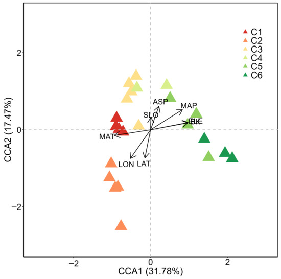 According to the coefficient of determination (R2) of each environmental variable (Table 1), ELE was the most influential factor, followed by BK, and then by MAP, MAT and LON. C1, C2, and C3 were grouped on the lower elevation side, characterized by higher MAT but lower MAP and BK (Figure 4). In contrast, C4, C5, and C6 were found at higher elevations, exhibiting higher MAP and lower MAT, along with an elevated BK (Figure 4).