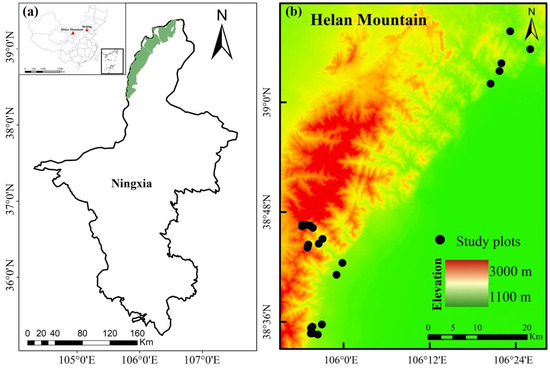 The study area (38°19′–39°22′ N, 105°49′–106°41′ E) was situated in the northwest region of Ningxia, China (Figure 8). In this region, the MAT fluctuates between 8.2 °C and 8.6 °C, with extremes of −8.54 °C in January and 21.43 °C in August. The MAP registers at 209.2 ± 57.2 mm, with around 44% of this precipitation occurring in July and August [32]. Typically found in temperate mountain forest ecosystems, higher elevations tend to have lower temperatures, while precipitation tends to increase with elevation. The main plant species are Agropyron mongolicum, Prunus mongolica, Caragana stenophylla, Ulmus glaucescens, Juniperus rigida, Pinus tabuliformis, and Picea crassifolia [69,70].