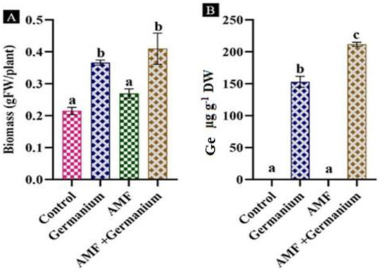 Puerner et al. [49] found that Ge increases the biomass and root length of treated plants. [49]. In their review, Liu et al. [26] stated that GeO2 treatment increases root activity and promotes the root growth and development of maize (Zea mays L.). Additionally, prior research has shown that Ge can promote seedling growth in vegetables, grains, and medicinal plants [50]. The synergetic effect of AMF and Ge can be explained by the enhanced ability of AMF to absorb vital nutrients, including P and Ge, which in turn stimulates plant growth and biomass production. Previous studies have indicated that AMF can access even the smallest soil pores, thereby promoting plant growth and enhancing nutrient and water absorption, ultimately leading to increased crop yields [51]. For instance, according to Zhang et al. [52], AMF facilitate the uptake of minerals (P, K, Fe, Zn, and Mn) by plant root. In this context, treating AMF enhanced nutrient uptake from organic fertilizers by stimulating acid and alkaline phosphatase activity [53]. This, in turn, facilitated phosphorus acquisition, boosted photosynthesis, and promoted overall plant growth. Similar to essential elements, Ge at low concentrations can also play a role in promoting plant growth through improving crop quality by boosting nutritional content, thereby improving the quality of fruits and vegetables [27].