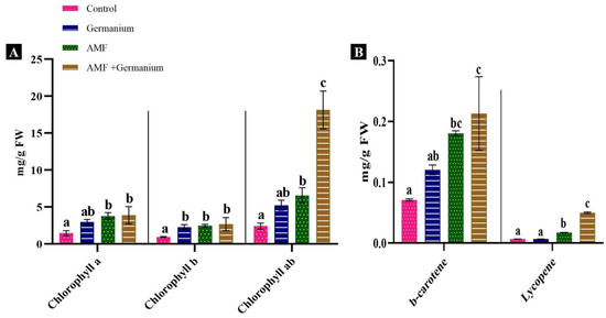 The effect of combined AMF and Ge priming on the photosynthetic pigment of spinach plants was investigated. The results showed that the treatments significantly enhanced chlorophyll a, chlorophyll b, total chlorophyll a + b, beta-carotene, and lycopene levels compared to the control (Figure 2). The Ge treatment alone increased these photosynthetic parameters to levels lower than those observed with AMF alone. AMF treatment alone increased chlorophyll a by 156.4%, chlorophyll b 160%, total chlorophyll by 171.9%, beta-carotene by 157.1%, and lycopene by 200% (p < 0.05). The combined AMF and Ge treatment caused the highest increases in chlorophyll a (165.3%), chlorophyll b (184.2%), and total chlorophyll (649.5%) (Figure 2A). In addition, beta-carotene and lycopene increased by 200% and 400%, respectively (Figure 2B).
