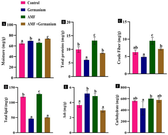 Effect of different treatments on proximate composition, (A): moisture, (B): total protein, (C) crude fiber, (D): total lipd, (E): ash content, (F): carbohydrates. Values expressed as means ± standard error of three independent replicates. Different letters above the bars, within the same organ, indicate significant differences between means at p = 0.05 using Tukey’s post hoc test.