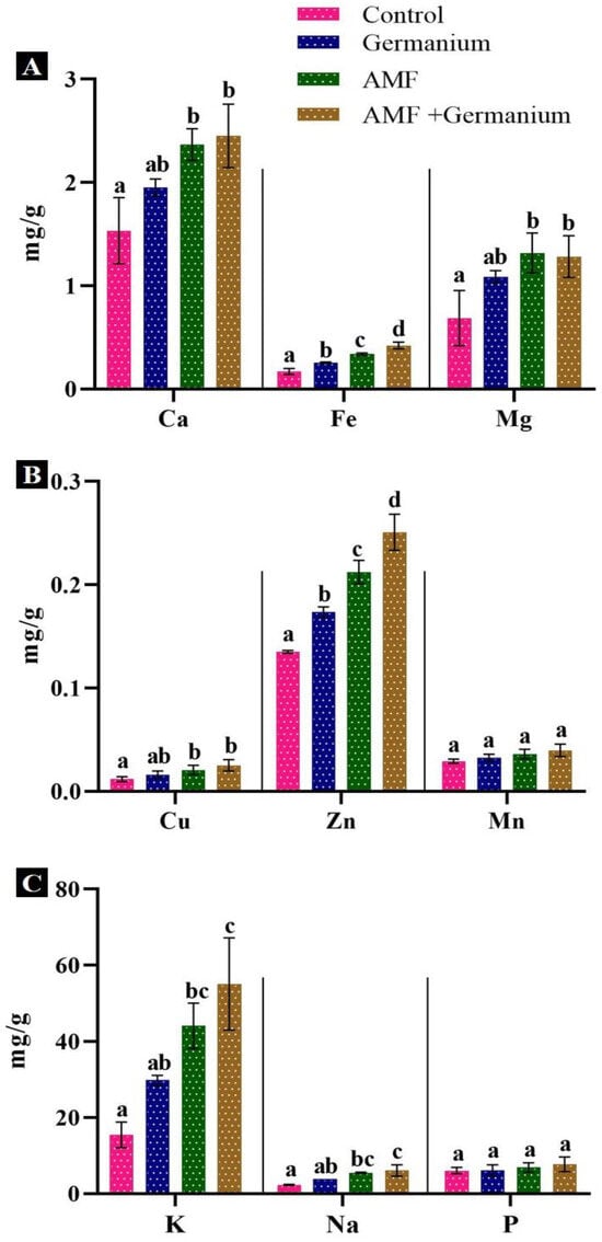 Concerning mineral contents, AMF-treated plants, Ge-treated plants, and their combined-treated plants displayed significantly higher contents (p < 0.05) of all measured minerals (Figure 4). Magnesium (Mg) and phosphorus levels increased by 91.3% and 30.8%, respectively, and iron (Fe) content increased by 100% (Figure 4A). Zinc (Zn) and manganese (Mn) levels increased by 61.5% and 33.3%, respectively, in AMF-treated plants in comparison with the untreated plants (Figure 4B). AMF treatment alone resulted in the highest increases in potassium (K), sodium (Na), and phosphorus (P) by 159.4%, 139%, and 30.8%, respectively (Figure 4C). Ge treatment led to increased content of all measured elements, with the highest increases in K and copper (Cu) by 92.4% and 200%, respectively. The combined Ge and AMF treatment resulted in the highest increases in all studied minerals.